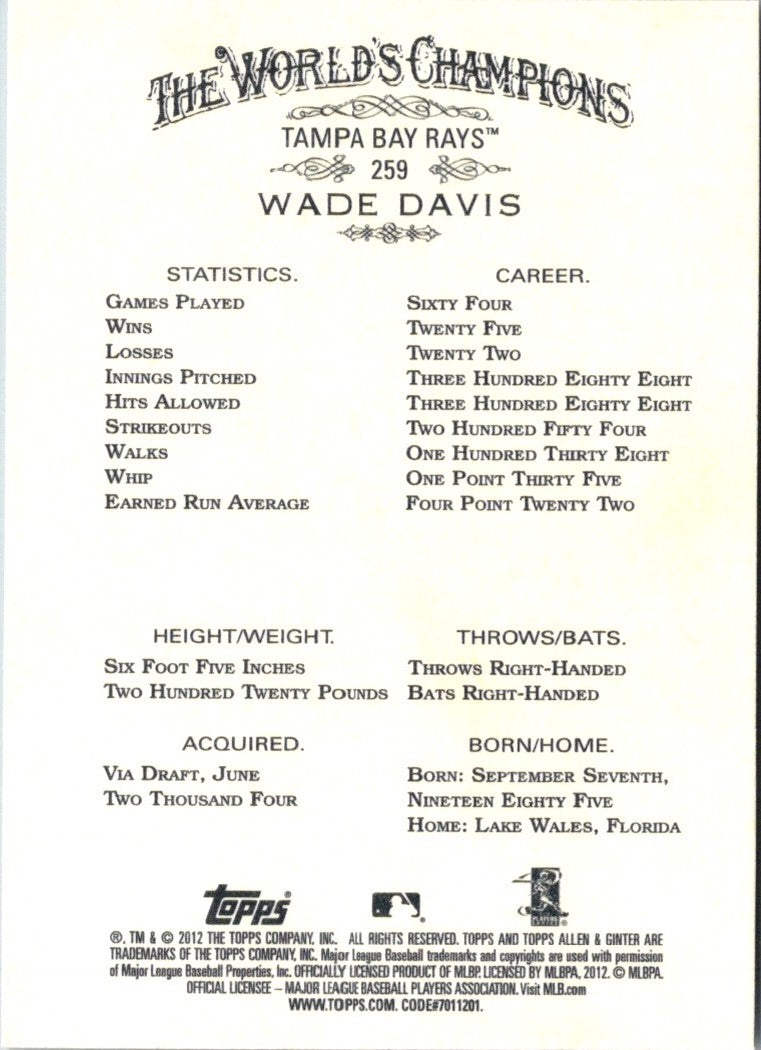 This 2012 Topps Allen & Ginter Wade Davis #259Tampa Bay Rays card is the perfect addition to any collector’s collection. Featuring a full-color photo of Davis in his Rays uniform, this card is a must-have for any fan of the Tampa Bay Rays. The card is printed on durable card stock and is sure to stand the test of time. It's a great way to commemorate a successful season and capture a bit of baseball history. Add this memorable piece of memorabilia to your collection today!