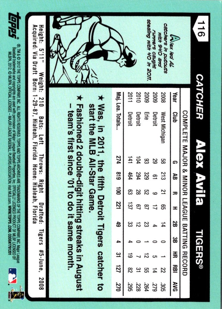 This 2012 Topps Archives Alex Avila #116 Detroit Tigers card is a must-have for any Tigers fan. Featuring Avila at the plate in his classic blue and orange uniform, this card is sure to be a classic in any collection. With a full color portrait on the front, and a brief biography and stats on the back, this card is full of Detroit Tigers history. Add this piece of Tigers memorabilia to your collection today and relive the 2012 season.