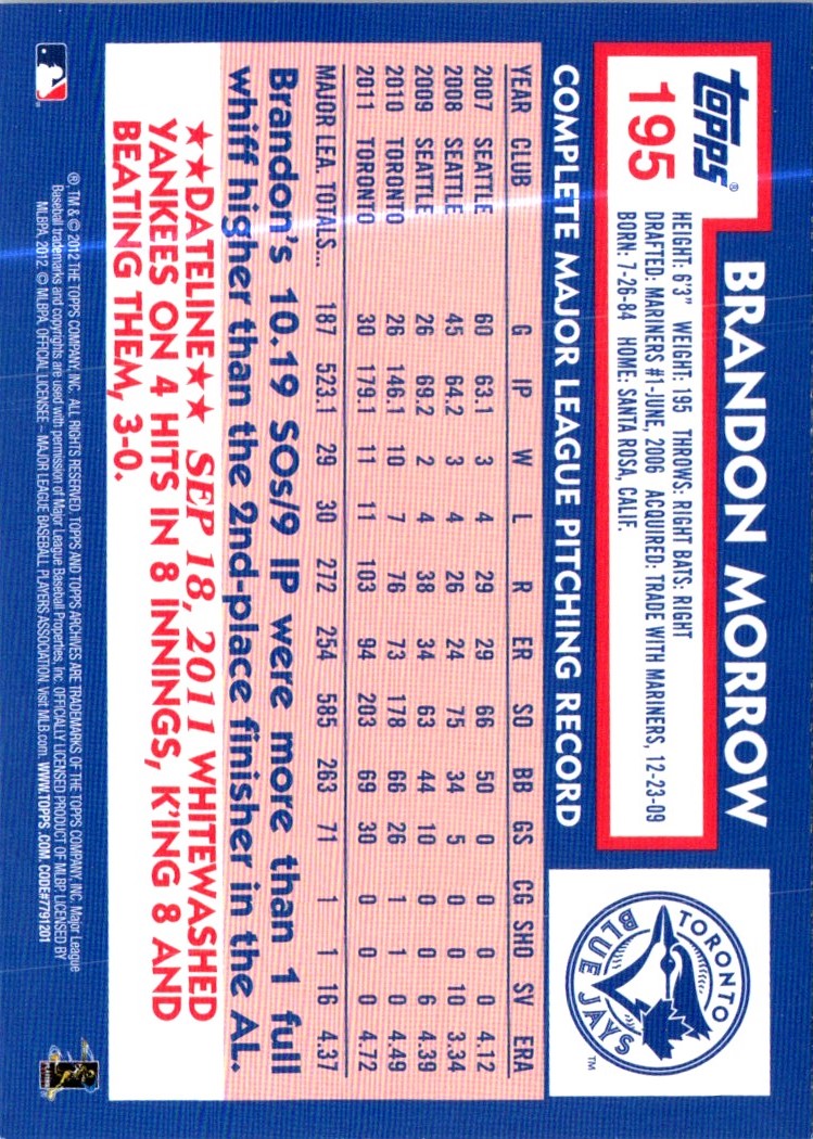 This 2012 Topps Archives Brandon Morrow #195 Toronto Blue Jays card is the perfect addition to any baseball fan's collection. Featuring Morrow in a classic Blue Jays uniform, this card is sure to please any fan of the team. The front of the card showcases Morrow in full action, with a bright and vibrant color scheme that will make any collector proud. The back of the card also includes detailed statistics and information about Morrow and his career with the Blue Jays. This card is a must-have for any Toronto Blue Jays fan, and a great way to show your support for the team and its players.