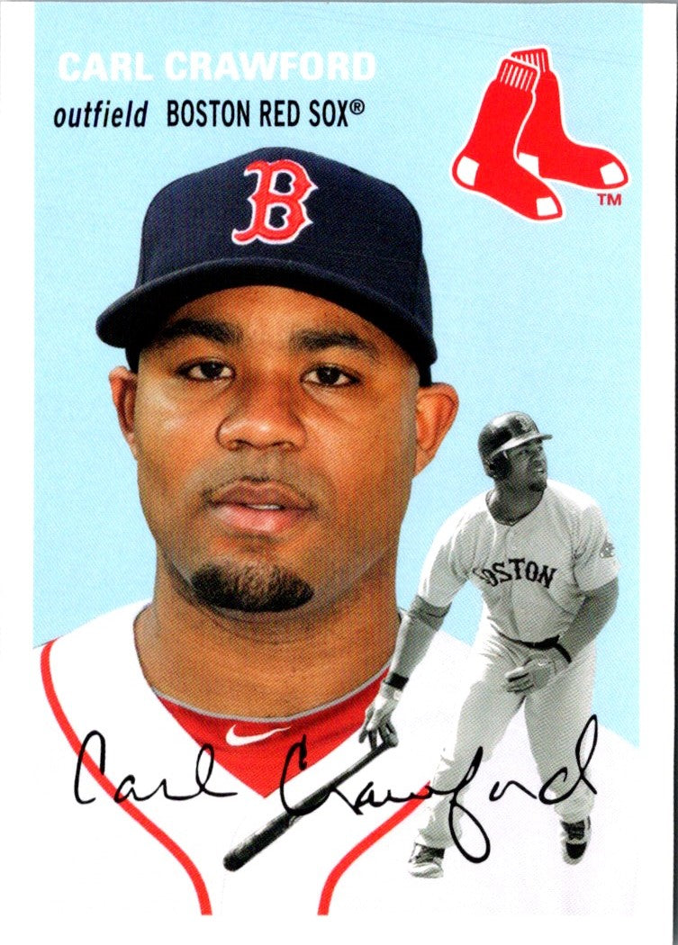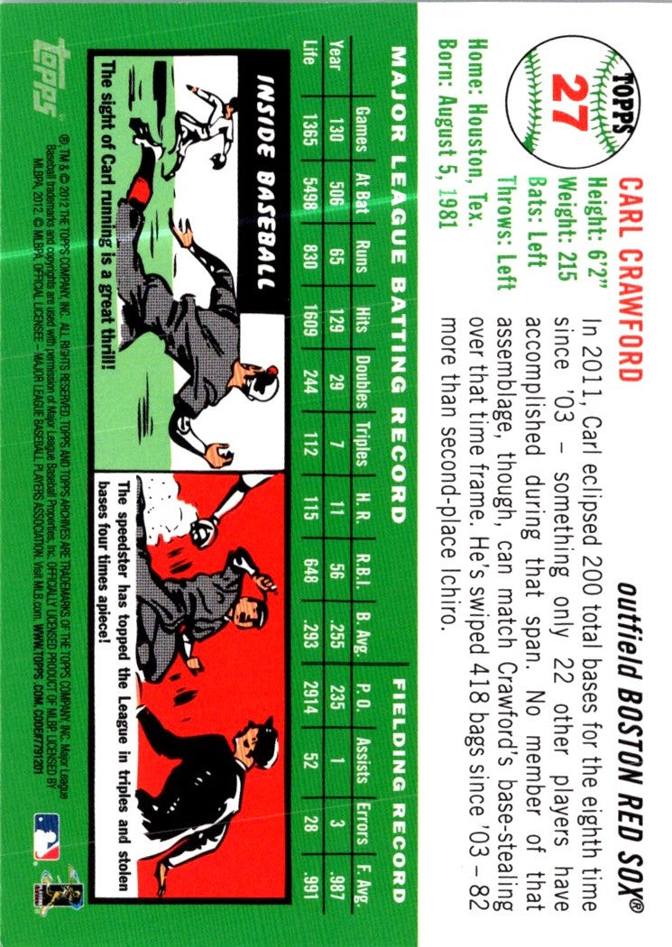 The 2012 Topps Archives Carl Crawford #27 Boston Red Sox card is a must-have for any baseball fan! This card features a color photo of Crawford in his classic Red Sox uniform, along with his name and team logo. Show off your Red Sox pride by adding this card to your collection today! This is an official Topps product that is sure to become a classic. Don't miss out on adding this piece of history to your collection!