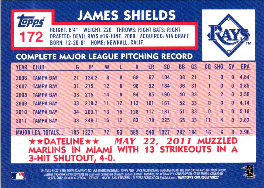 This 2012 Topps Archives James Shields #172 Tampa Bay Rays card is the perfect way to celebrate the career of a notable MLB player. Featuring a great action shot of Shields in his Rays uniform, this card celebrates his impressive career. Show your support for Shields or add it to your collection of MLB memorabilia. This card is sure to be a great addition to your collection.
