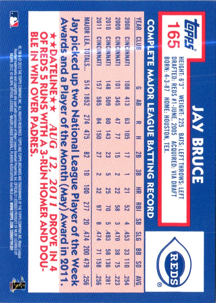 This 2012 Topps Archives Jay Bruce #165 Cincinnati Reds card features an iconic image of the former Reds' outfielder in his signature batting stance. This card captures the essence of Bruce and is a must-have for any fan of the three-time All-Star. With crisp details and a vibrant color palette, this card is sure to be a great addition to any collection.