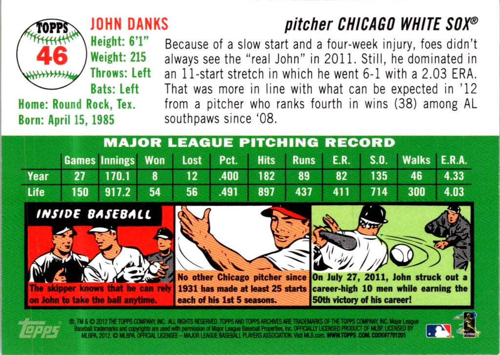 This 2012 Topps Archives John Danks #46 card is a must-have for any major Chicago White Sox fan. Featuring the veteran left-handed pitcher in his signature blue and white uniform, this card is sure to add a sense of nostalgia to any collection. With its bold graphics and vibrant colors, this card is sure to stand out among the rest. Add this card to your collection and commemorate the star pitcher's career with the White Sox.