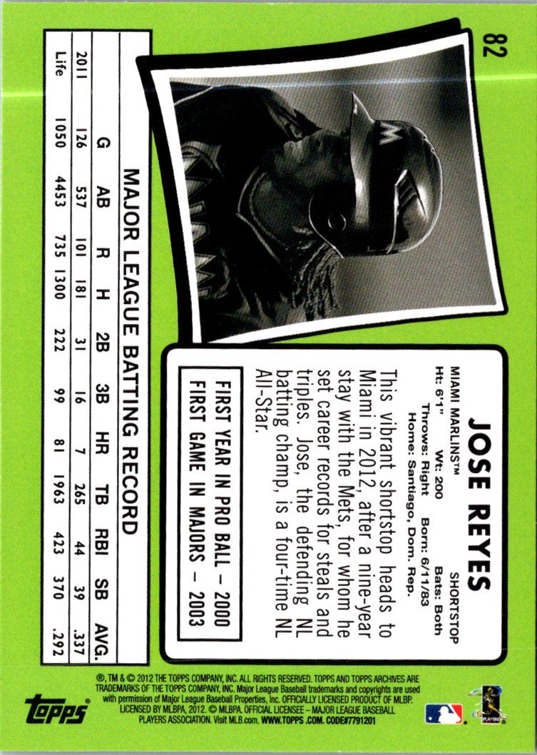 This 2012 Topps Archives Jose Reyes #82 Miami Marlins card is an absolute must-have for any collector! Featuring an iconic image of Jose Reyes in action with the Marlins, this card captures a special moment in his illustrious career. This card is printed on premium card stock and is sure to make a great addition to any collection. An official MLB product, this card is sure to be valued for years to come. Add this Jose Reyes card to your collection today!