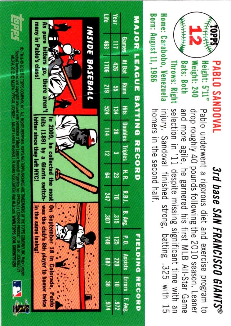 Add a piece of Pablo Sandoval's career to your collection with the 2012 Topps Archives #12! This beautiful card features an action shot of Sandoval in his classic Giants uniform with the team's iconic logo in the background. Its white borders add a clean and classic look to the card, making it a must-have for any Giants fan. This card is sure to become an instant classic, get your copy today!