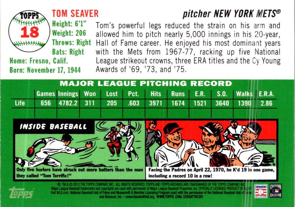 Celebrate the legacy of the iconic Tom Seaver with this 2012 Topps Archives Baseball card! Featuring a crisp image of Seaver in his classic Mets uniform, this card is a great way to commemorate the career of one of the most beloved pitchers in baseball history. This card is perfect for any Mets fan or collector looking to add a classic piece of baseball history to their collection. Add this Tom Seaver card to your collection today!