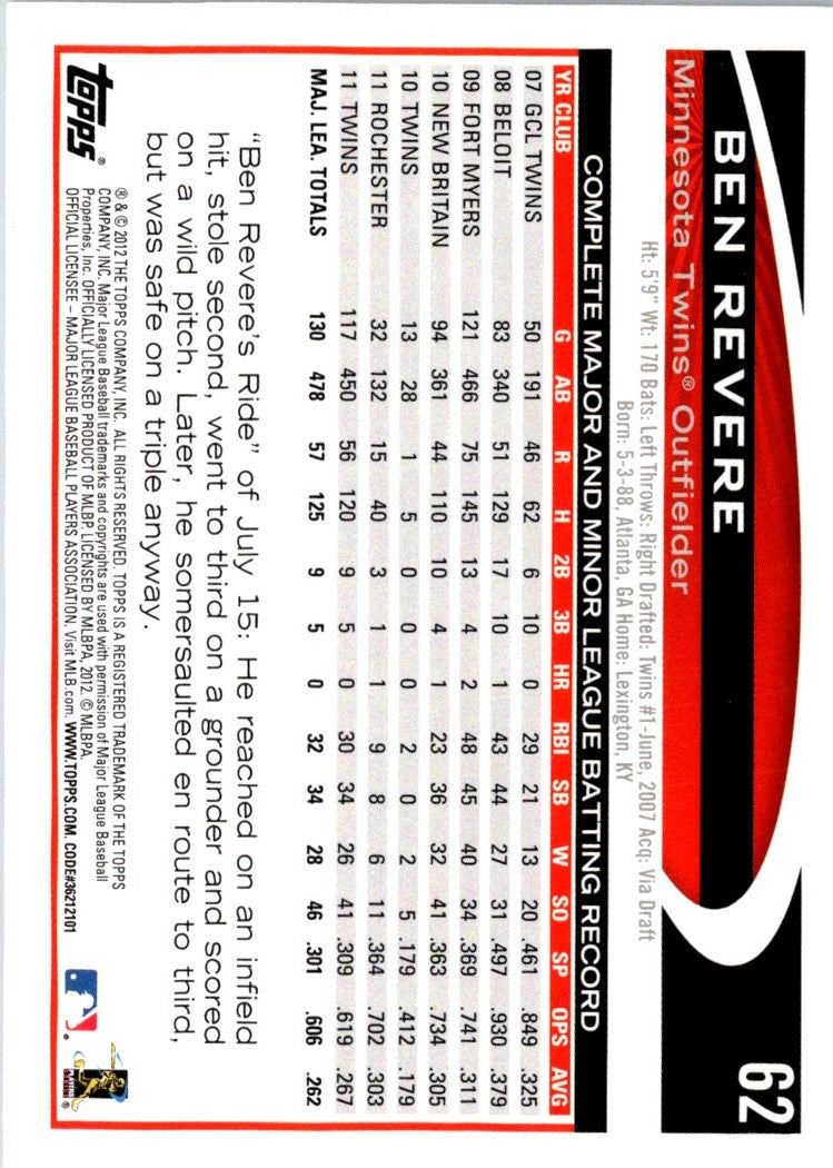 This 2012 Topps Ben Revere #62Minnesota Twins card features a great action shot of the outfielder in mid-swing, with his trademark batting stance on full display. The card also features his full stats and team information, making it a must-have for any Twins fan. Revere was a fan favorite in Minnesota and this card is a great way to commemorate his time with the Twins. Add this card to your collection today and show your Twins pride!