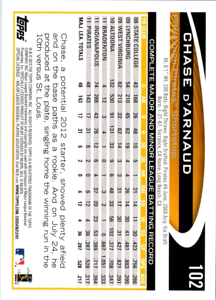 This 2012 Topps Chase d'Arnaud #102 Pittsburgh Pirates card is the perfect addition to any baseball fan's collection! Featuring the former Pirate catcher in a classic batting stance on the front, and his career stats on the back, this card is a must-have for any collector or fan. Show your support for Chase d'Arnaud, and get your hands on this card today!