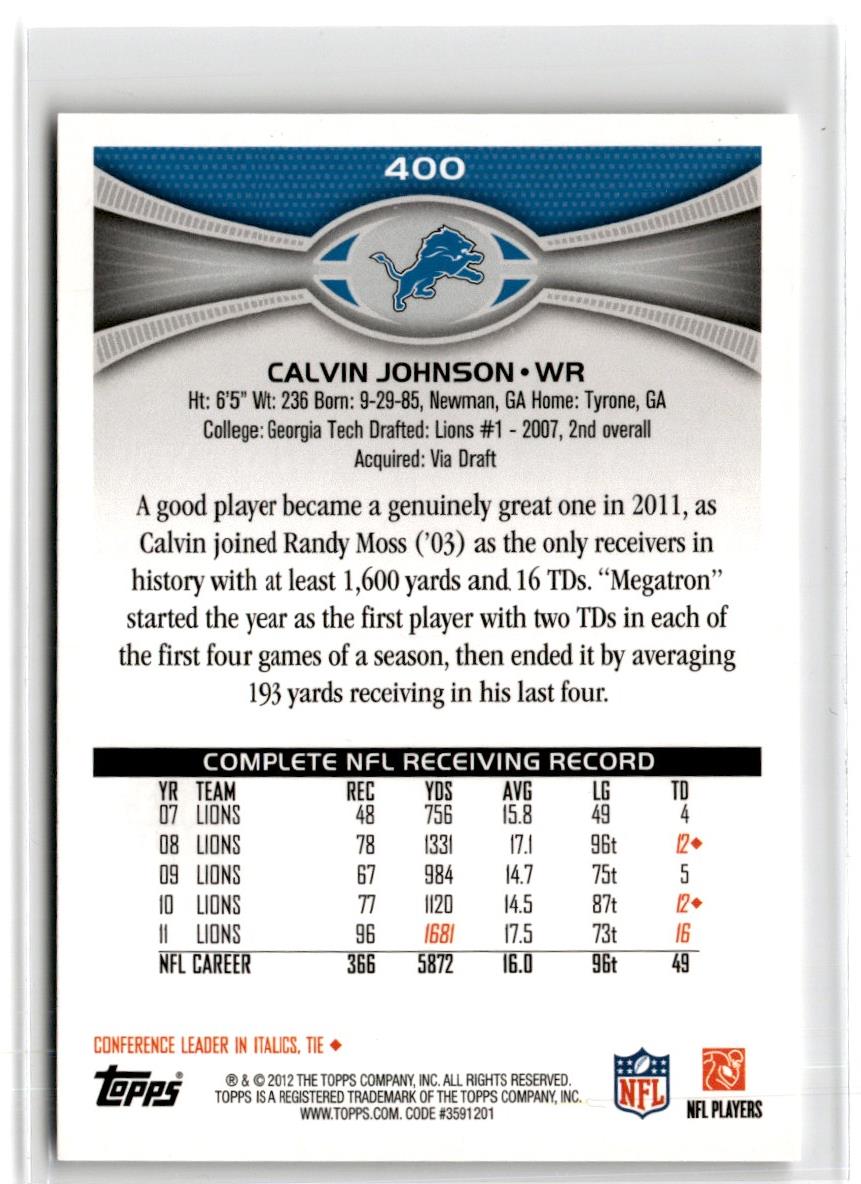 This 2012 Topps Chrome Pink Refractors Calvin Johnson #115 Detroit Lions card is loaded with eye-catching detail. The bright pink refractor finish creates a stunning look that is sure to catch the attention of any fan. The card features a high-quality image of Johnson in his Lions uniform, ready to take on any competition. The back of the card has all the stats you need to keep track of the star wide receiver's accomplishments. Add this card to your collection and show your support for one of the NFL's top players.