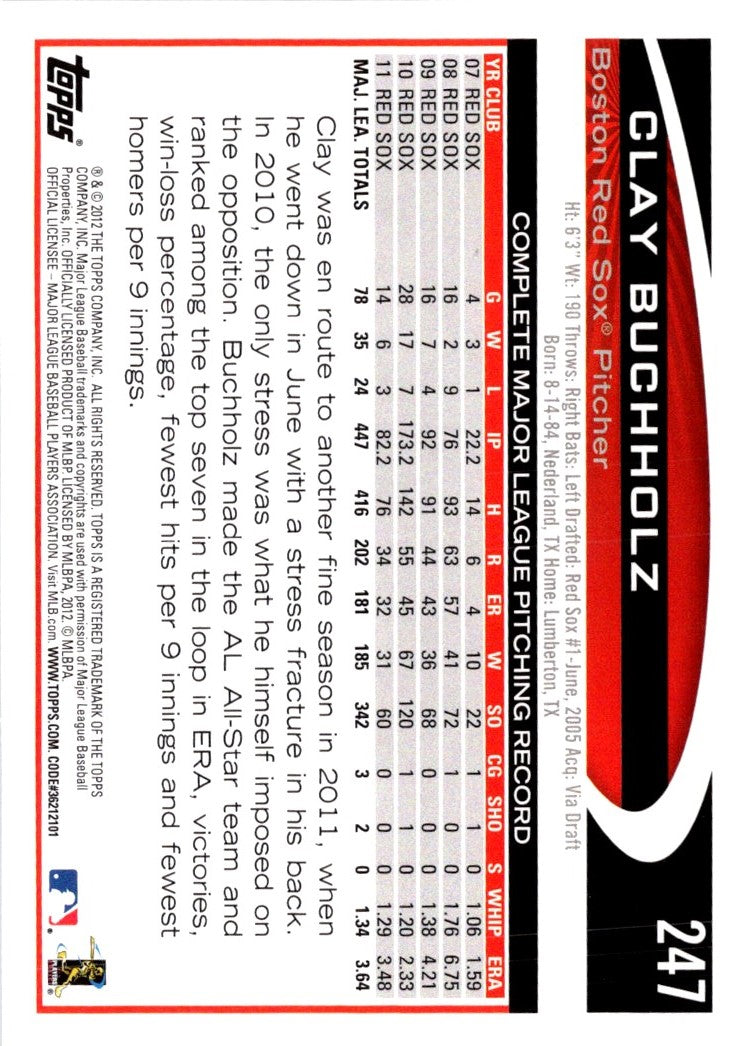 2012 Topps Clay Buchholz #247 is the perfect addition to any Boston Red Sox fan's collection. Featuring a full-color image of Buchholz in his classic Red Sox jersey, this card captures the excitement and energy of Boston baseball. This card celebrates one of the most dominant pitchers of the 2012 season, and makes for a great display piece. Add this card to your collection today and show your support for the Boston Red Sox!