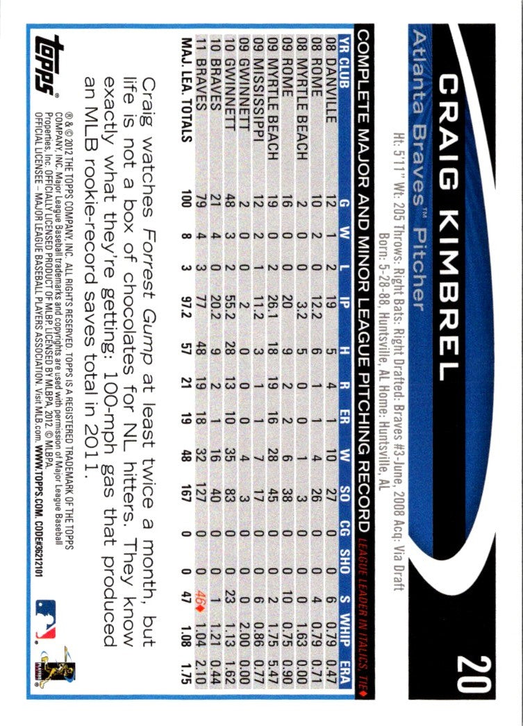 This 2012 Topps Craig Kimbrel #20 Atlanta Braves card is a must-have for any collector! Featuring a glossy finish and vibrant colors, the card depicts the talented pitcher in a classic action shot. A great addition to any collection or an ideal gift for a Braves fan, this card is sure to become a treasured piece.