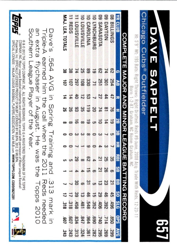 This 2012 Topps Dave Sappelt card (#657) celebrates the Cubs outfielder's first full season as a major leaguer. Sappelt hit .266 with 18 doubles, 2 triples, 6 home runs, and 33 RBI in 2012. The card showcases a fantastic action shot of Sappelt at the plate and the back of the card includes detailed career statistics. Add this card to your collection to remember Sappelt's first full season with the Cubs.
