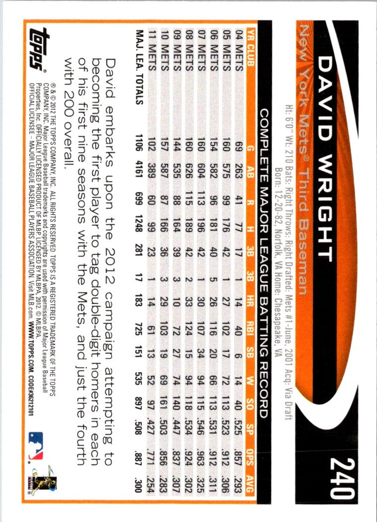 Representing the New York Mets, David Wright is one of the most beloved players in the history of the team. The 2012 Topps David Wright #240 card is a must-have for any Mets fan. Featuring an action shot of the iconic third baseman, this card captures the energy and excitement of the game. With a glossy finish and bright colors, this card is sure to make a great addition to any collection. Show your support for the Mets and add this card to your collection today!