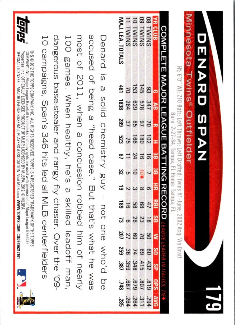 2012 Topps Denard Span #179 Minnesota Twins card is a must-have for any Twins fan. Featuring Span in his signature batting pose, this card celebrates his remarkable career in the MLB. Span is depicted in his classic style with the Twins uniform, making it a great collector's item. This card is printed on high-quality card stock with a glossy finish, making it a durable piece of memorabilia for any fan. Span's stats and accomplishments are also featured on the back of the card, making it a great way to commemorate his time with the Twins. Get your hands on this card today and show your support for your favorite player!