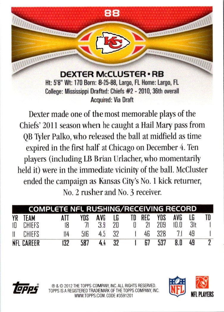The 2012 Topps Dexter McCluster #88 Kansas City Chiefs card is the perfect addition to any collector's set. Featuring a detailed close-up of the electric Chiefs running back, this card is sure to be a hit for any fan of the team or collector. Show your support for the talented McCluster and his team with this card, and be assured that it will remain in mint condition for years to come. Get your hands on this card and add it to your collection today!