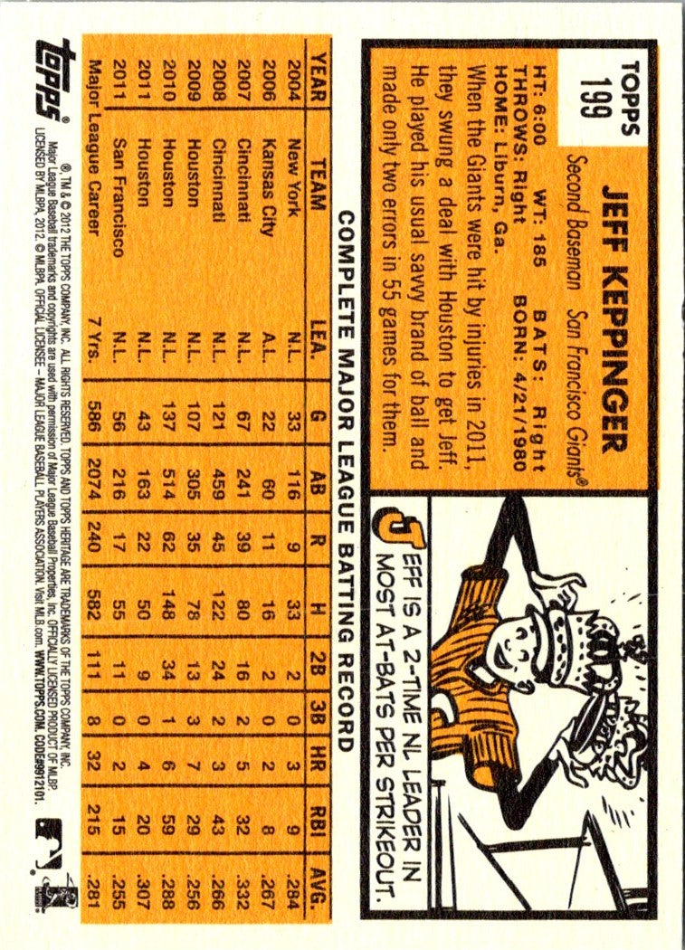 This 2012 Topps Heritage Jeff Keppinger #199 card features the San Francisco Giants infielder in his home whites. This card is in mint condition and features a crisp, clear image of Keppinger at the plate. Every detail of Keppinger's uniform is visible, down to the SF logo on his cap. This card is a must-have for any Giants fan and is sure to be a treasured addition to any card collection. Add this card to your collection today and show your Giants pride!