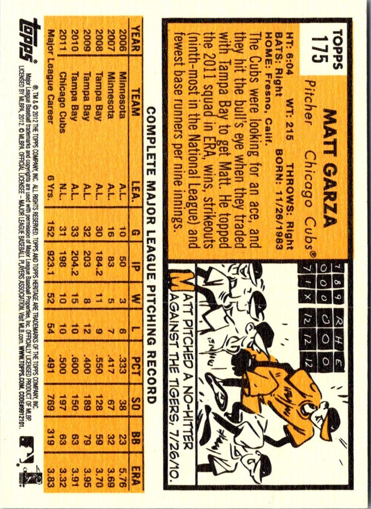 This 2012 Topps Heritage Matt Garza #175 Chicago Cubs card is a must-have for any collector! Featuring a great action shot of Garza pitching, this card is sure to be the highlight of your collection! The card is in near-mint condition, with sharp corners and no creases or scuffs. It also features a glossy finish and vibrant colors that will make it stand out from the rest of your cards. With Matt Garza being a key cog in the Chicago Cubs success, this card will be sure to remain a favorite among collectors for years to come. Add this card to your collection today and you won't be disappointed!