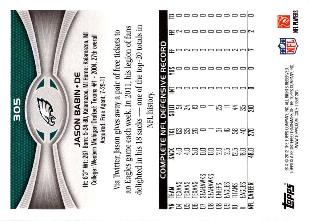 This 2012 Topps Jason Babin #305 Philadelphia Eagles card is a must-have for any football fan. Featuring a bold action shot of the talented defensive end, this card is sure to be a treasured part of any collection. Showcase your love for the Eagles and this star player with this stunning card. A great addition to any collection, this card is sure to be a standout. Add it to your collection today!