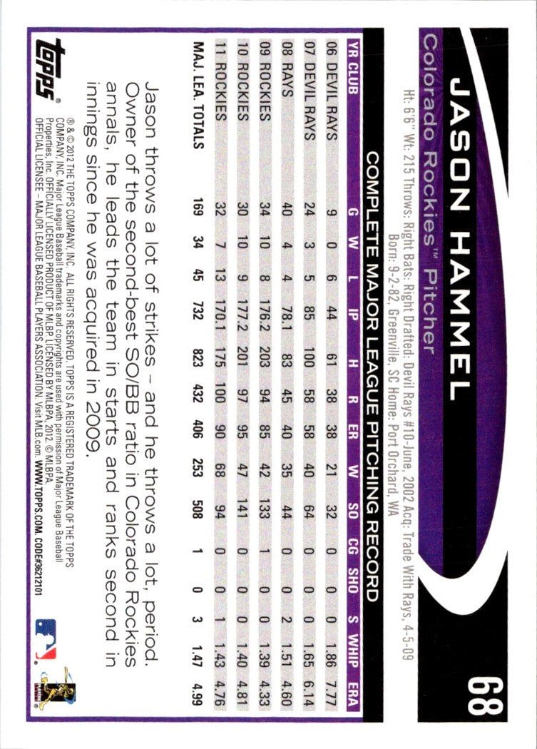 This 2012 Topps Jason Hammel #68 Colorado Rockies card showcases the ace pitcher in full action. Show off your favorite player in style with this durable card that is sure to last for years to come. Featuring a full-color image on the front and details about Hammel's career on the back, this card is a must-have for any Rockies fan. Get your hands on this card and show off your Rockies pride!