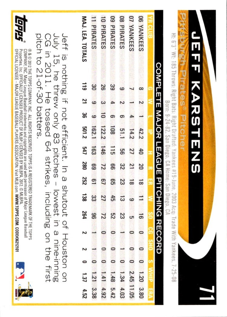 Welcome to the 2012 Topps Jeff Karstens #71 Pittsburgh Pirates card! This card features an action portrait of Jeff Karstens on the mound in his signature Pirates uniform, ready to take the mound and dominate the opposition. The card is printed on high-quality card stock, giving it a premium feel that will make it a treasured addition to any collection. With its vibrant colors and crisp details, this card is sure to be a standout piece in your collection. Add it to your collection today and show off your Pittsburgh Pirates pride!