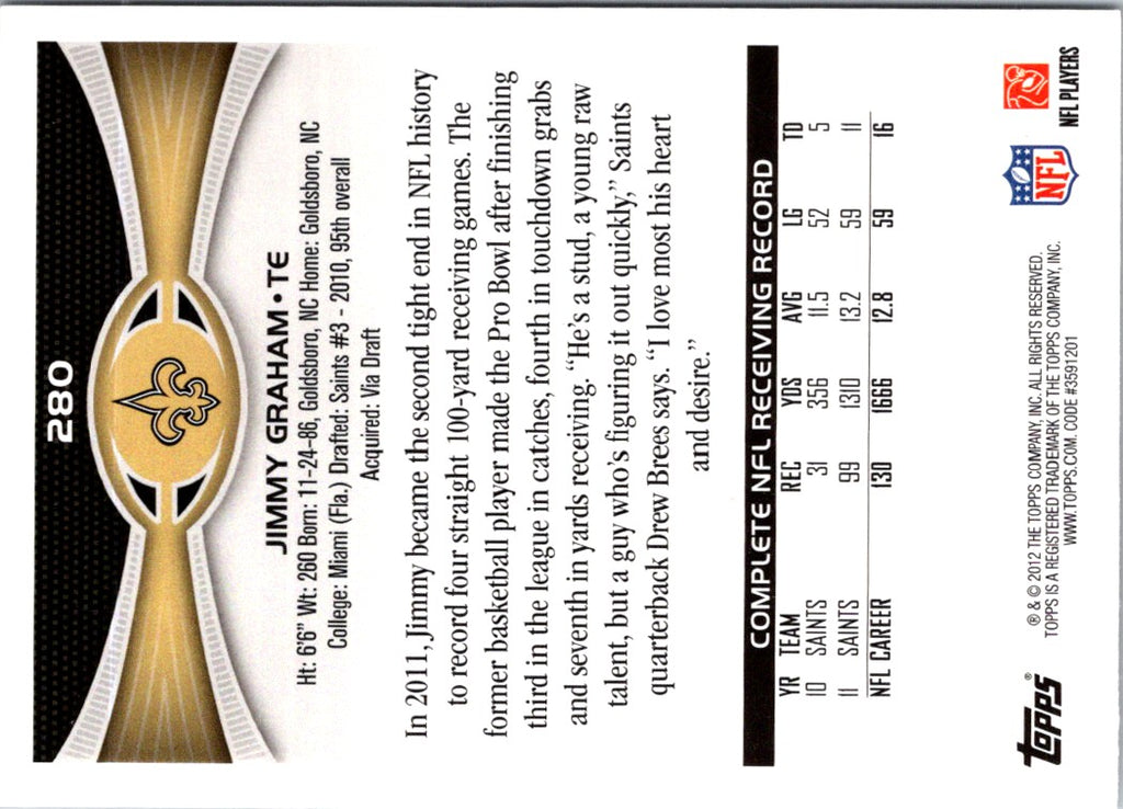 The 2012 Topps Jimmy Graham #280 card is a must-have for any New Orleans Saints fan. This card captures the former All-Pro tight end in stunning detail, showcasing his unique size and athleticism. Graham was a major contributor to the Saints offense during his 5 year tenure in the Crescent City, making several highlight reel plays that will never be forgotten. Add this timeless piece of Saints history to your collection today and remember the great Jimmy Graham!
