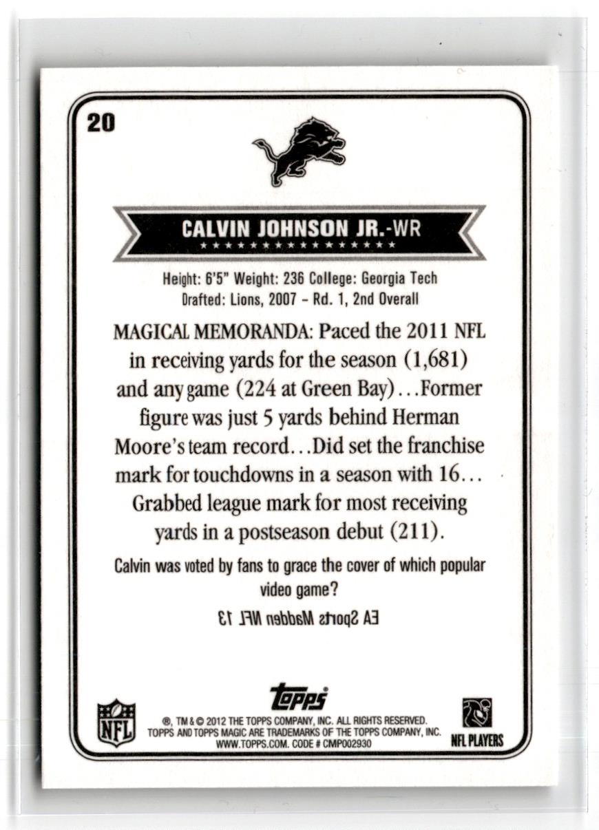 This 2012 Topps Magic Calvin Johnson #20Detroit Lions card is a great addition to any Detroit Lions fan's collection. Featuring the legendary wide receiver in action, the card is printed on thick card stock and has been coated with a glossy finish. The back of the card contains Johnson's career stats, making it a perfect addition to any fan's collection. Whether you're a fan of the Detroit Lions or just a fan of Johnson himself, this is a must-have card for any collector.