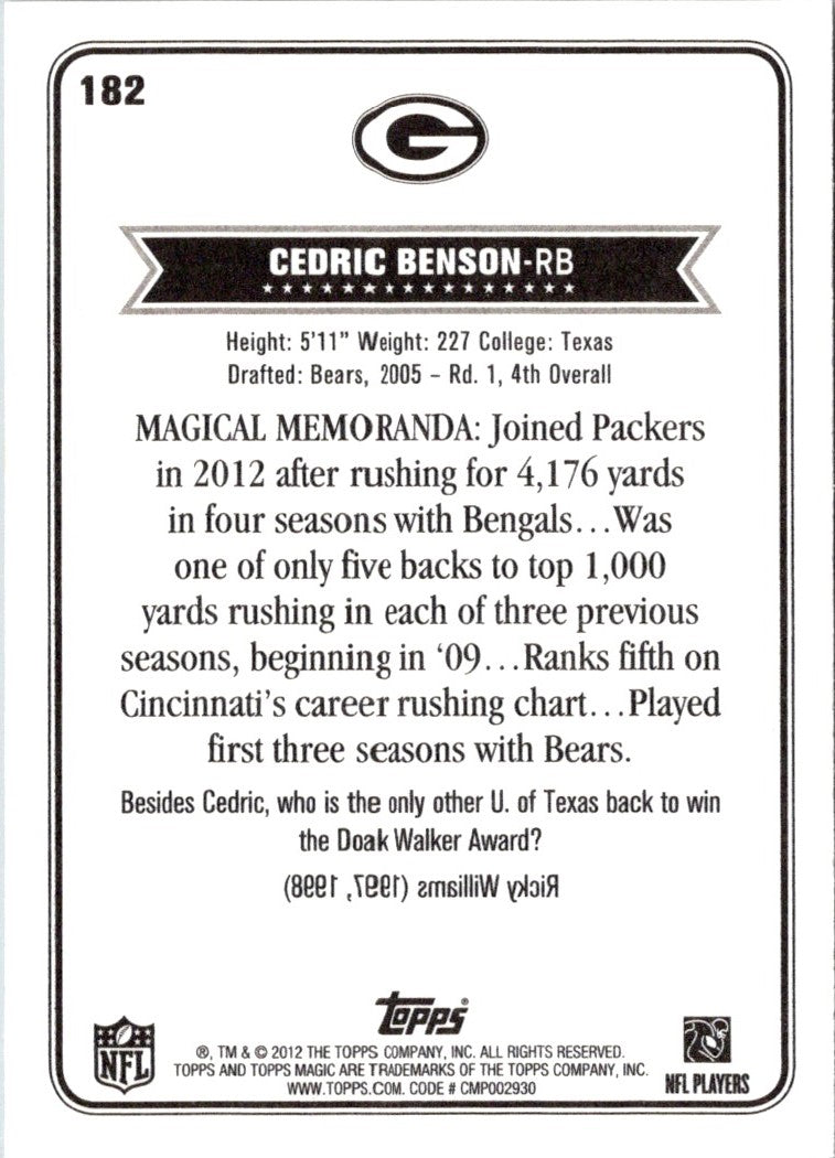 This 2012 Topps Magic Cedric Benson #182 Green Bay Packers card is a must-have for any serious collector! Featuring a vibrant and detailed image of Cedric Benson in action, this card is sure to become a cherished part of any collection. The crisp, glossy finish of this card will ensure it stands out from the rest. Whether you're starting a collection or adding to an existing one, this card is sure to make a great addition. Add this card to your collection today!