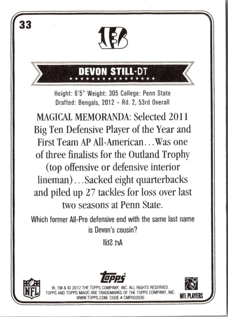 This 2012 Topps Magic Devon Still #33 Cincinnati Bengals trading card is a must-have for all Bengals fans and football card collectors. It features a full-color photo of Still in action, with a white and orange Bengals uniform and helmet. The card also includes all of his career stats, making it a great way to show your support for the Bengals and Still. Add this card to your collection today and show your pride in the Bengals!