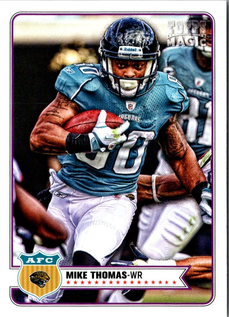 This 2012 Topps Magic Mike Thomas #27 Jacksonville Jaguars card is an exclusive collectible for any fan. Featuring a glossy image of Mike Thomas looking for the pass, this card is the perfect addition to any collection. With a crisp, clean design, this card is sure to show off your fandom in style. Whether you're a die-hard Jaguars fan or just an admirer of the sport, this card is sure to be a treasured item. Add this card to your collection today and show your support for the Jacksonville Jaguars!