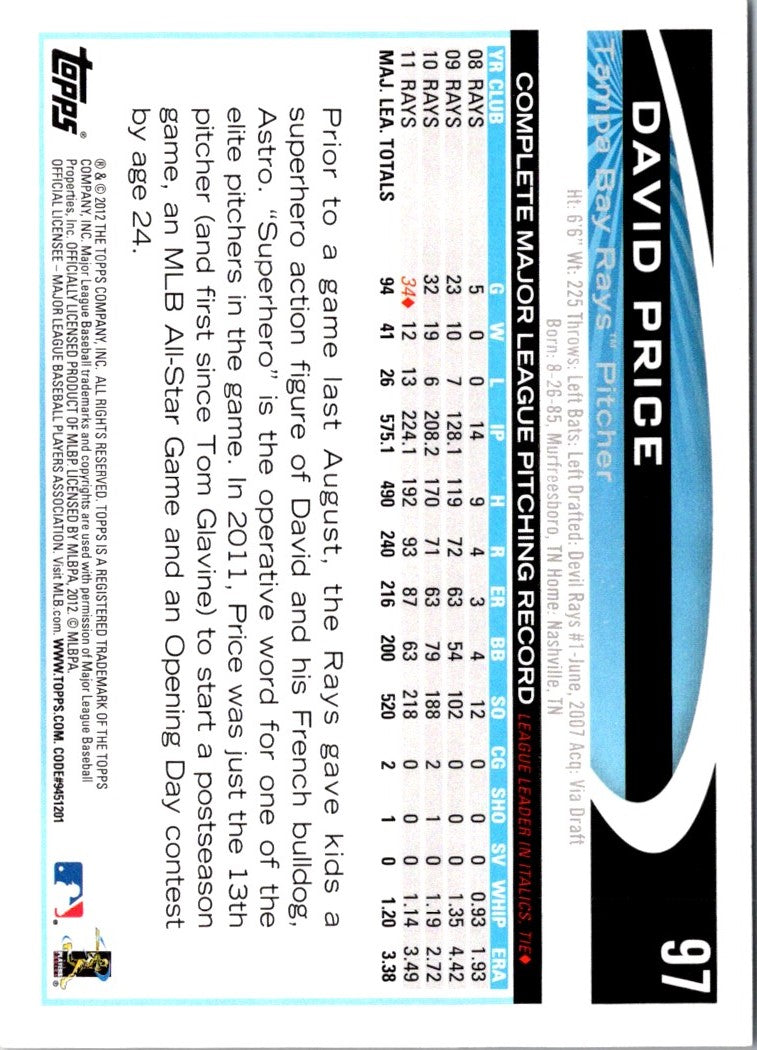 The 2012 Topps Opening Day David Price #97 card is a must-have for any Tampa Bay Rays fan. It features a high-quality image of Price in his Rays uniform, ready to take the field. The card also showcases an impressive statistic list of his 2011 season accomplishments, making it a great collectable for any fan. Add it to your collection today and join the millions of baseball card collectors around the world.
