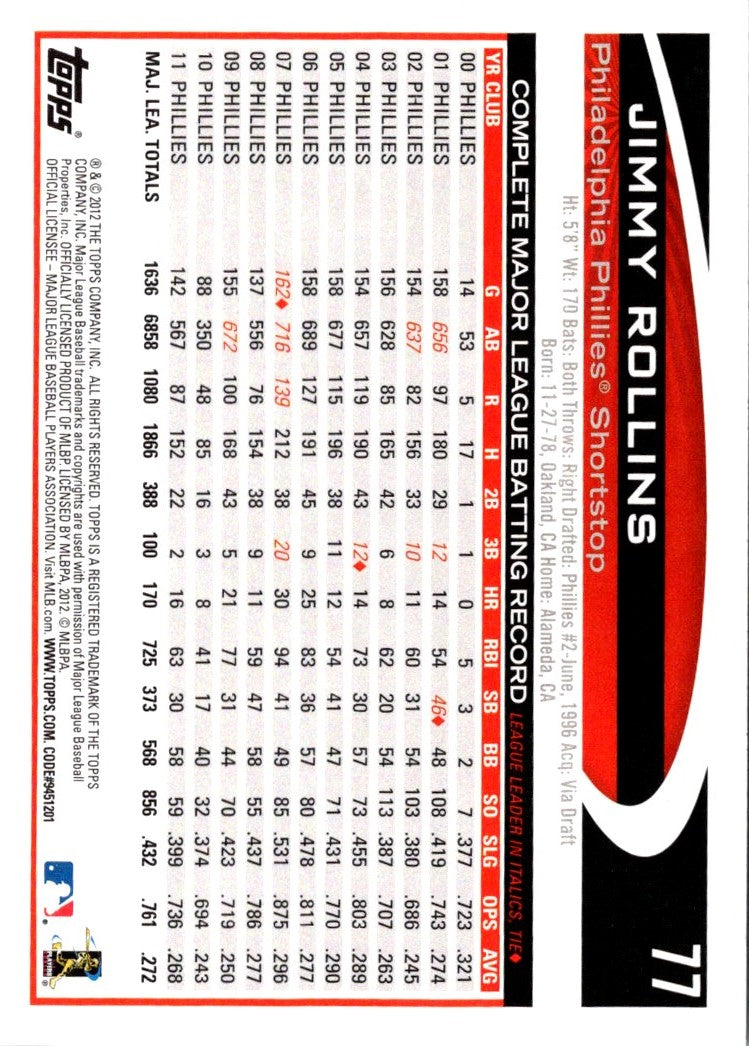 This 2012 Topps Opening Day Jimmy Rollins #77 Philadelphia Phillies card is a must-have for any true fan of the sport. Own a piece of history with this standard-sized card featuring a classic action shot of Jimmy Rollins in a Phillies jersey. The glossy card has a vivid print of Rollins in full swing, and the back of the card features his stats and career highlights. This card also comes with an Opening Day logo and Opening Day checklist, making it a valuable collector's item. Add this to your collection and show off your Phillies pride!