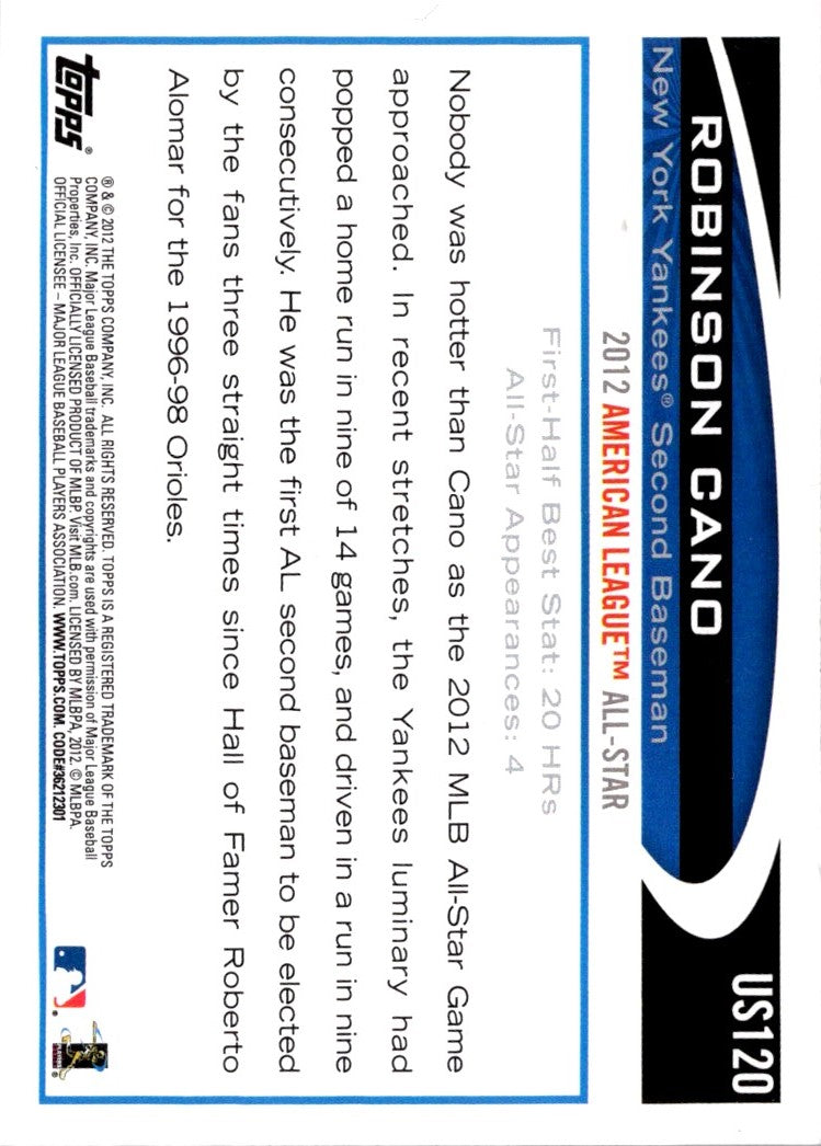 Introducing the 2012 Topps Robinson Cano #US120 New York Yankees card! This card captures the energy and excitement of the legendary Yankees slugger in full color, glossy action. With a great design featuring a close-up of Robinson Cano, you can feel like you are part of the action. This card is perfect for any Yankees fan or card collector. Don't miss your chance to add this card to your collection!
