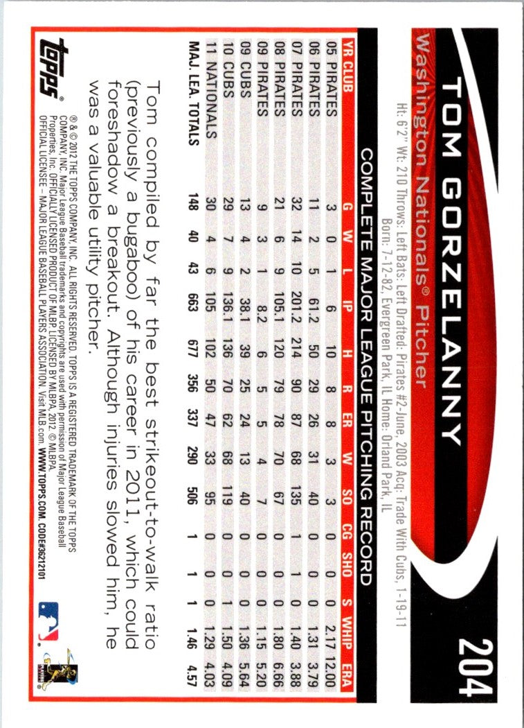 This 2012 Topps card of Tom Gorzelanny is a must-have for any Washington Nationals fan! Featuring an action photo of Gorzelanny in his Nationals uniform, this card is sure to be a prized addition to any baseball card collection. Add this card to your collection today and celebrate one of the Nationals' best pitchers!