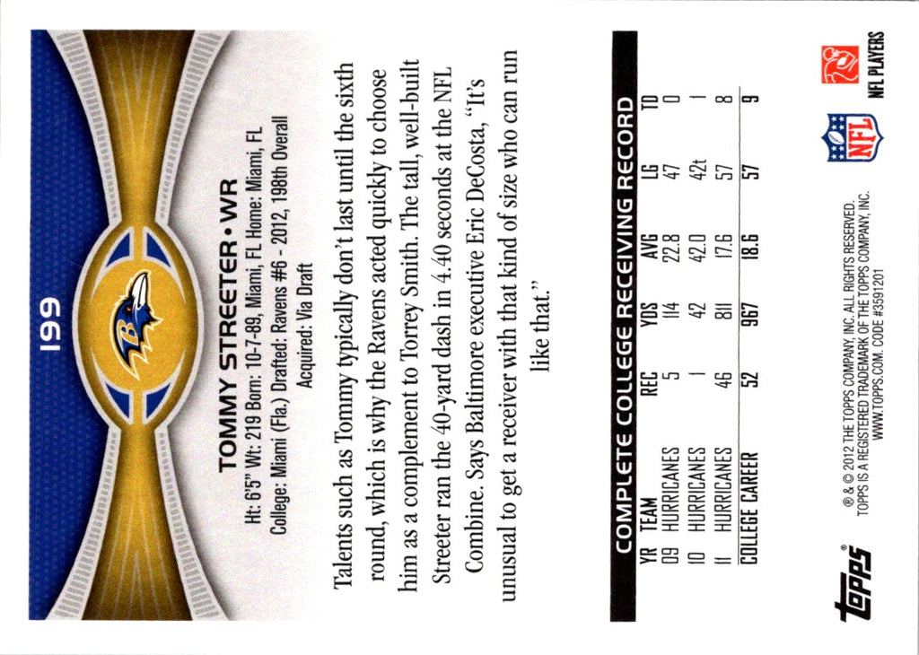 This 2012 Topps Tommy Streeter #199 card is a must-have for any serious Baltimore Ravens fan! Show your support for the team and their star wide receiver with this classic card. Featuring a full color image of Streeter in his white and purple Ravens uniform, this card is sure to be a reminder of all his amazing accomplishments on the field. With its high quality construction and vibrant coloring, this card is built to last. Add this card to your collection today and cheer on the Ravens for years to come!