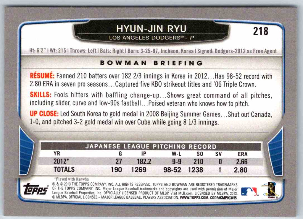 This 2014 Bowman Hyun-Jin Ryu #218 is a must-have for any fan of the South Korean baseball sensation. Featuring a glossy image of Hyun-Jin in his Los Angeles Dodgers uniform, this card is a great way to commemorate the impressive career of this talented pitcher. Show off your passion for baseball with this exciting collectible. Enjoy the crisp blue and white colors of the Dodgers logo, and the vibrant colors of the Dodgers uniform. A perfect addition to any sports memorabilia collection!
