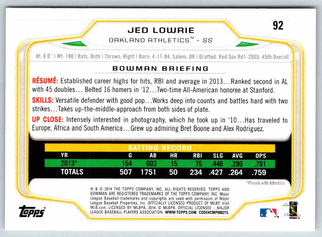 This 2014 Bowman Jed Lowrie #92 card is a must-have for any collector. Featuring a full-color action image of Jed Lowrie in his Oakland Athletics uniform, this card is a great representation of the All-Star infielder. The card is printed on high-quality cardstock and is protected by a special coating to ensure its longevity. The back of the card features a detailed biography and stats of Lowrie's career, making it a great addition to any collection. Don't miss your chance to own a piece of baseball history - order your 2014 Bowman Jed Lowrie #92 card today!
