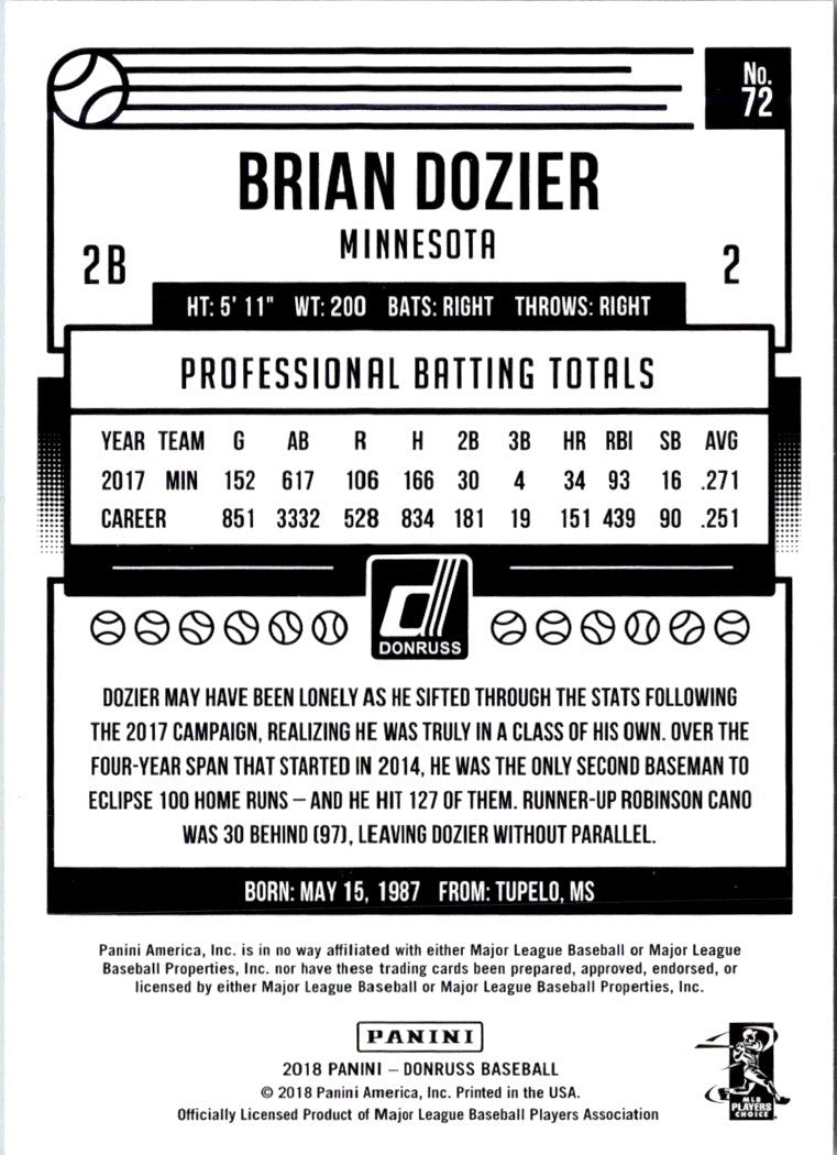 Brian Dozier of the Minnesota Twins is one of the most dynamic players in Major League Baseball. Now you can own a piece of the action with the 2017 Donruss Brian Dozier #2 card. Featuring a classic portrait of Dozier, this card is the perfect way to show your support for the Twins and your favorite player. Add it to your collection today and don't miss out on this must-have item!
