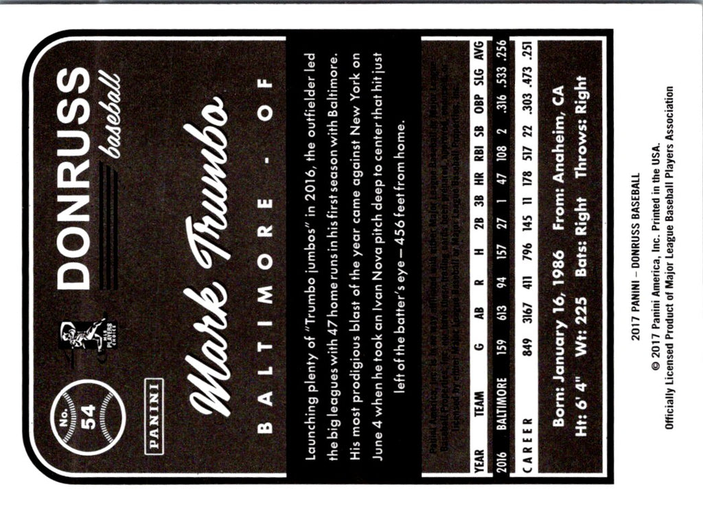 Updated for 2017, Mark Trumbo's Donruss card #54 is a must-have for any Baltimore Orioles fan. His dynamic pose captures the power of his swing while the full-color imagery brings the card to life. The card also features stats from the 2017 season and Trumbo’s career highlights. Get this card to complete your collection and celebrate one of the Orioles’ best!