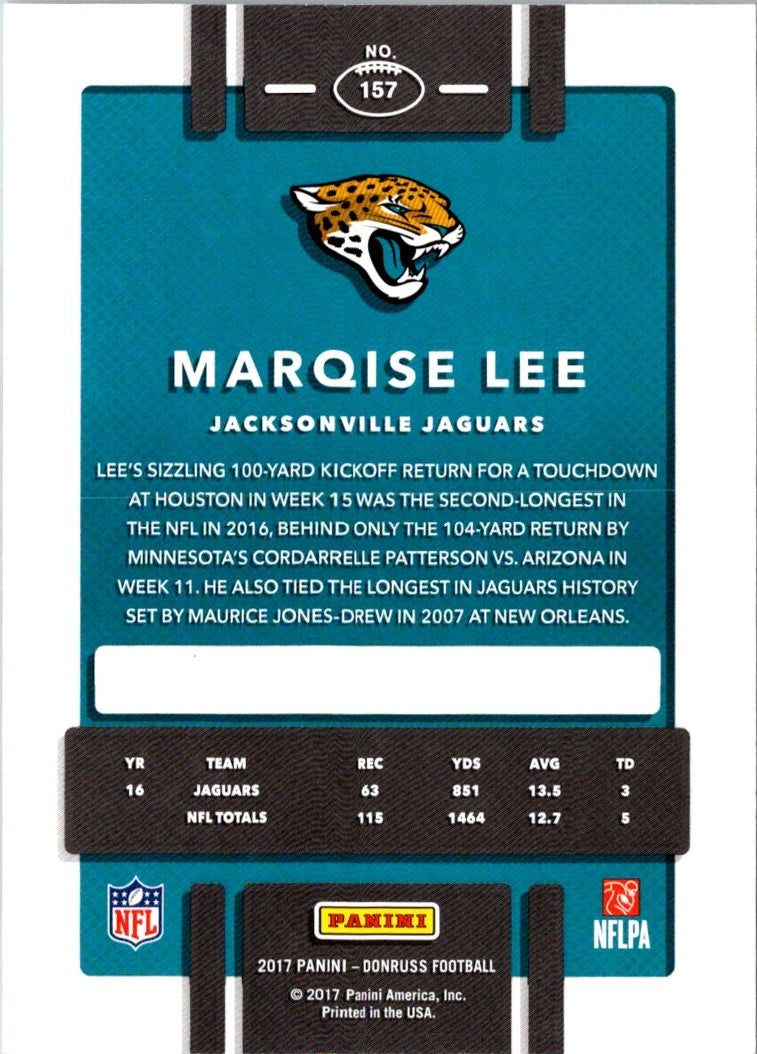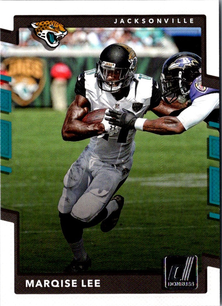 The 2017 Donruss Marqise Lee #157 is a must-have card for any die-hard Jacksonville Jaguars fan. Featuring the dynamic wide receiver in his team colors, this card captures the energy and excitement of the 2017 season. The card features a glossy finish and a full-bleed background, allowing the vibrant team colors to really pop. The back of the card also includes a full-color action shot, as well as Lee's vital stats and team information. Don't miss out on your chance to own this awesome collectible of one of the NFL's best wide receivers. Get your 2017 Donruss Marqise Lee #157 today!