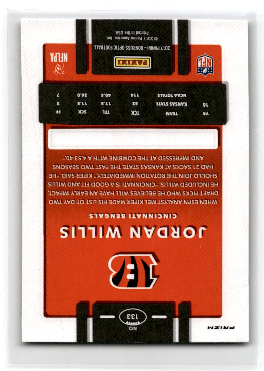 The 2017 Donruss Optic Jordan Willis #133 card celebrating the Cincinnati Bengal is a must-have for any fan of the team. This card features the player in full Bengals team colours, and it is the perfect way to show your support for the team. The card is printed on a glossy stock with an eye-catching design, and it is sure to be a great addition to any collection. The card also features career stats on the back, so you can track your favourite player's progress over the years. This card is a great way to show your allegiance to the Bengals and bring your collection to the next level.