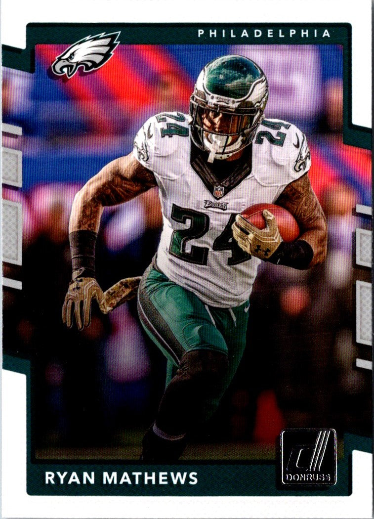 Ryan Mathews is a must-have for any serious Philadelphia Eagles collector. This 2017 Donruss card features a stunning action shot of Mathews in his signature white and midnight green uniform. The vibrant colors and crisp detail of the card make it a must-have for any collection. The card is a great way to commemorate Mathews' career with the Eagles and show your support for the team. With its bold design, this card is sure to become a treasured piece in any Eagles fan's collection. Pick up yours today and add a piece of Eagles history to your collection!