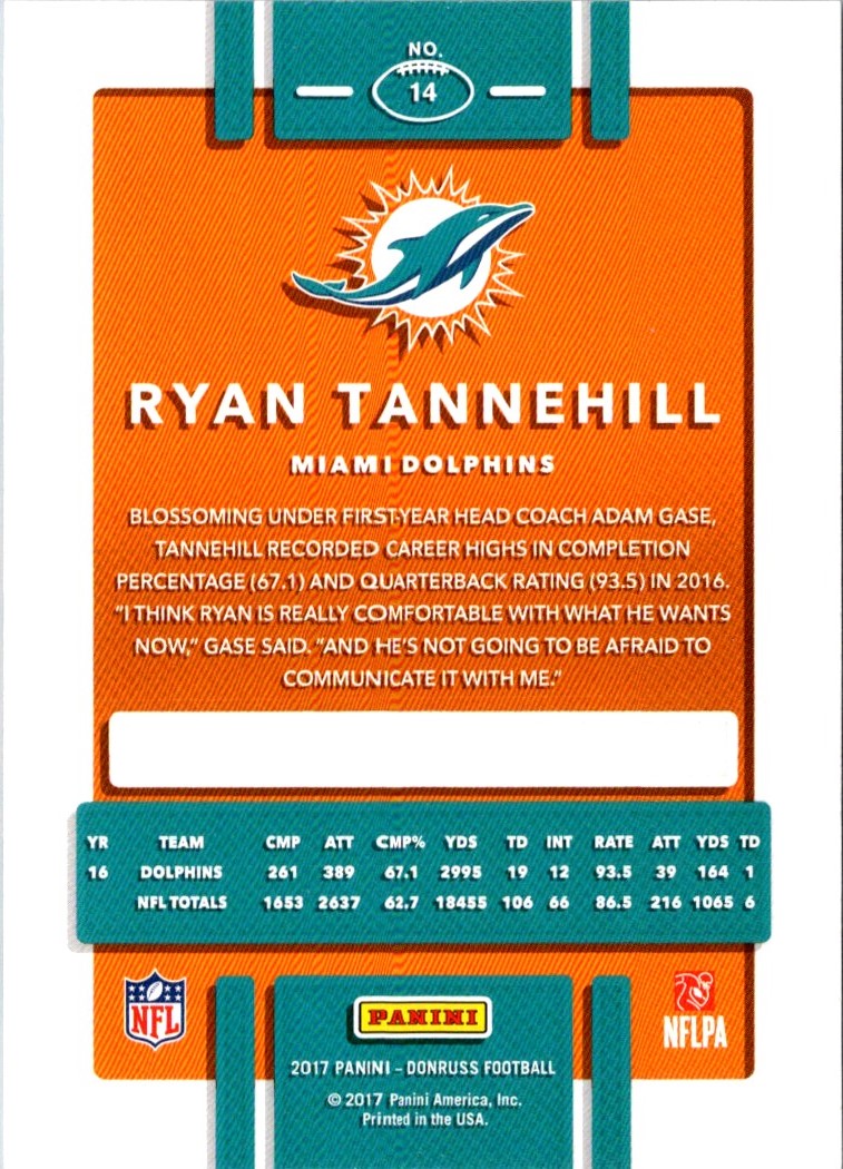 This 2017 Donruss Ryan Tannehill card #14 is a must-have for Miami Dolphins fans. Featuring a high-quality image of Tannehill in his signature Dolphins uniform, this card is sure to be a great addition to any fan's collection. With details like the team logo, a Dolphins-inspired background and Tannehill's name and number, this card is perfect for display or for trading. Get your hands on this unique piece of memorabilia before it's gone!