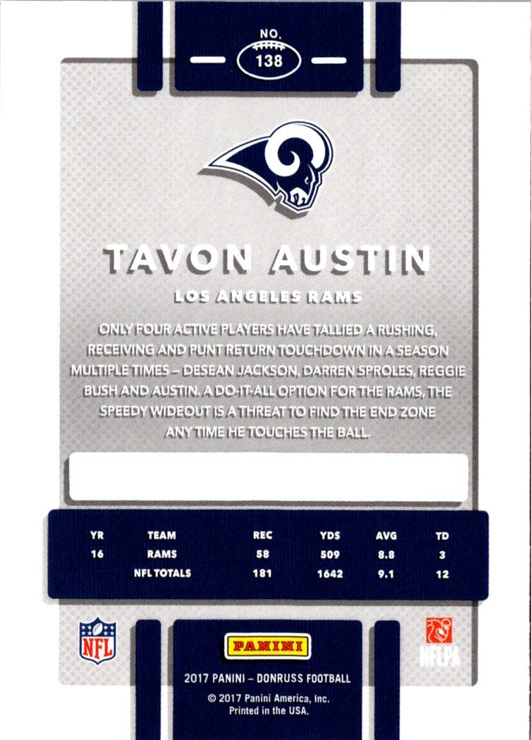 2017 Donruss Tavon Austin #138 is an essential card for any Los Angeles Rams fan or collector. It features an image of Austin wearing his classic Rams uniform and helmet. This card is printed on premium cardstock with a glossy finish, providing a great look and feel. It also features full-color action photography and detailed player stats. With 2017 Donruss Tavon Austin #138, you can proudly show off your favorite Rams player and add to your collection.