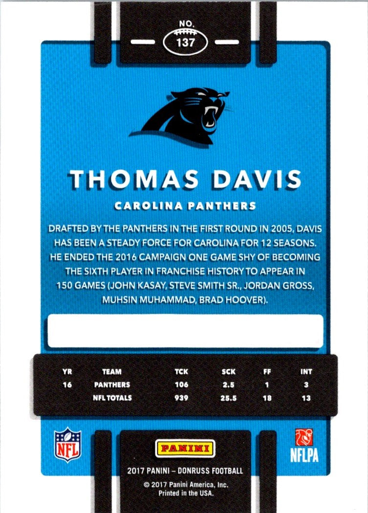 This 2017 Donruss Thomas Davis #137 card celebrates the Carolina Panthers' beloved linebacker. This card features Davis in his signature Panthers jersey and helmet, ready to make an impact on the field. With sharp and vibrant colors, this card is perfect for any collector looking to add a new and exciting card to their collection. Add this card to your collection today and show your support for Thomas Davis and the Carolina Panthers!