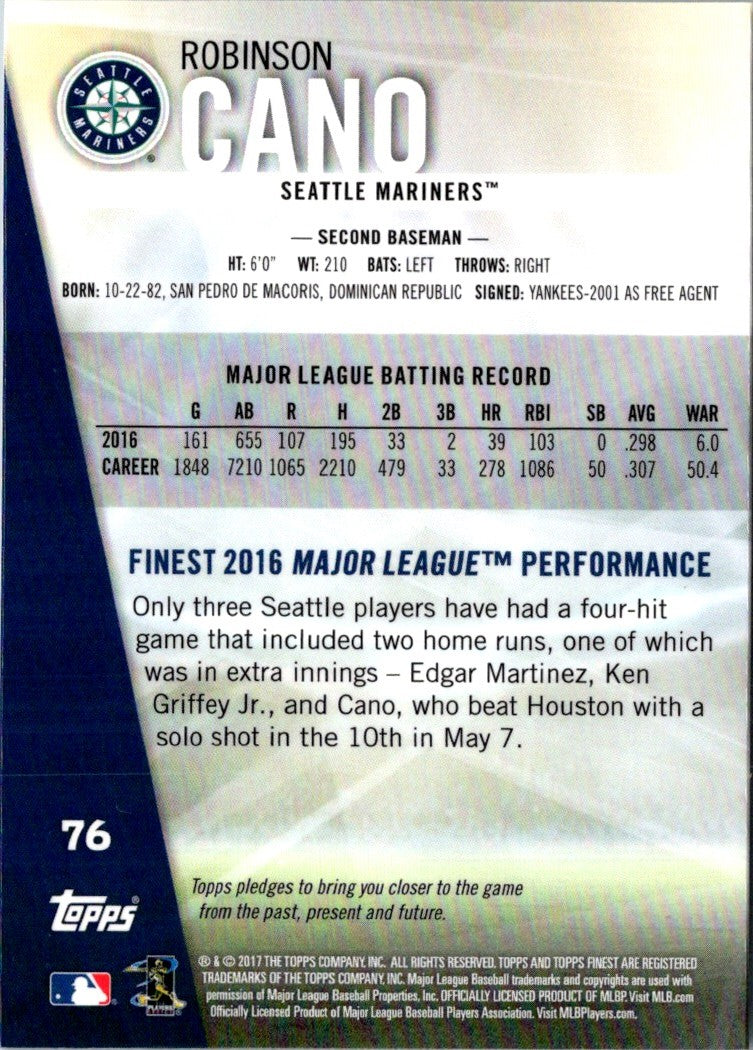 This 2017 Finest Robinson Cano #76 Seattle Mariners card is the perfect addition to any baseball fan's collection. Featuring full-color, vibrant imagery of the Mariners star, this card will forever capture the moment of greatness. With a glossy finish, this card is sure to stand out. Plus, it's a great way to honor one of the greatest players in the game. Add this card to your collection and show your appreciation for Robinson Cano.