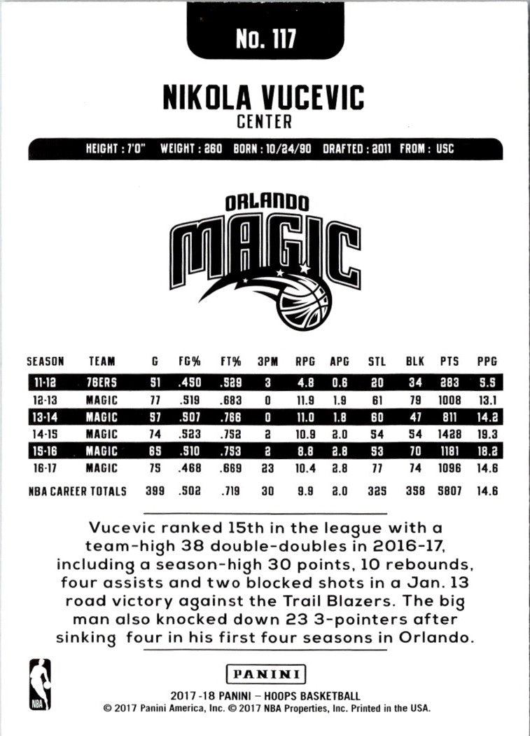 The 2017 Hoops Nikola Vucevic #117 Orlando Magic card is the perfect addition to any collector's collection! Show your support for your favorite team with this vibrant, full-color card featuring Vucevic in action for the Magic. This card is a must-have for any Magic fan, and an excellent way to show your team pride and support. With detailed action shots and vibrant colors, you won't want to miss out on this card! Get it now and add it to your collection!