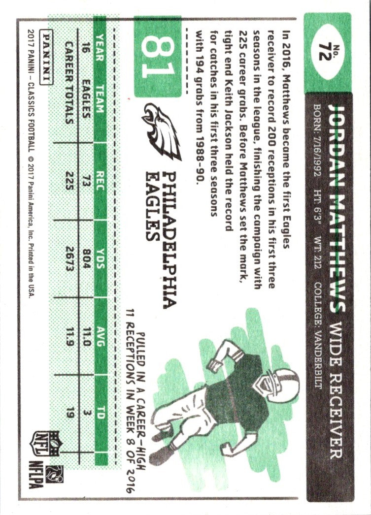 This 2017 Panini Classics Jordan Matthews #72 Philadelphia Eagles card is an absolute must-have for any serious collector. Featuring the action shot of Matthews in full flight, this card captures the power and dynamism of one of the NFL's most exciting players. Printed on high-quality card stock with a glossy finish, this card is sure to take pride of place in any collection. With a limited number of cards available, don't miss your chance to add this great item to your collection today!