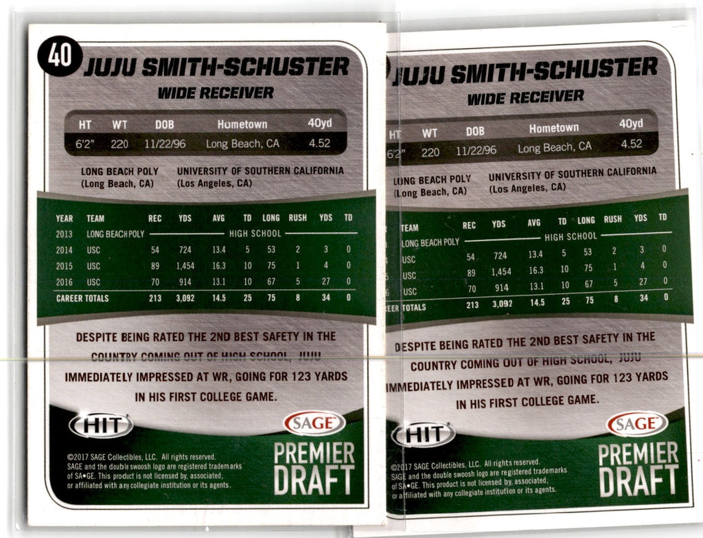 This 2017 Panini JuJu Smith-Schuster #40 Pittsburgh Steelers card is a must-have for any Steelers fan. You'll get a great look at the rookie wide receiver in his Steelers uniform, with a detailed image on the front of the card. The back features all of his career stats and information about JuJu's rookie year. Plus, you'll get a piece of Steelers history with this card as it marks JuJu's first card as a Steeler. Get your hands on this piece of Steelers memorabilia and show your pride for the Black and Yellow!