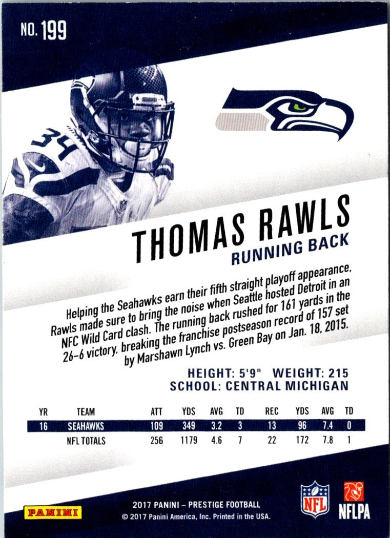 This 2017 Panini Prestige Thomas Rawls #199 Seattle Seahawks card celebrates the amazing career of one of the NFL's best running backs. The card depicts Rawls in action on the field, with bright colors and sharp detail. Rawls' stats, awards, and career highlights are highlighted on the back of the card. This card is the perfect addition to any collection of NFL memorabilia, and an essential for any Seahawks fan.