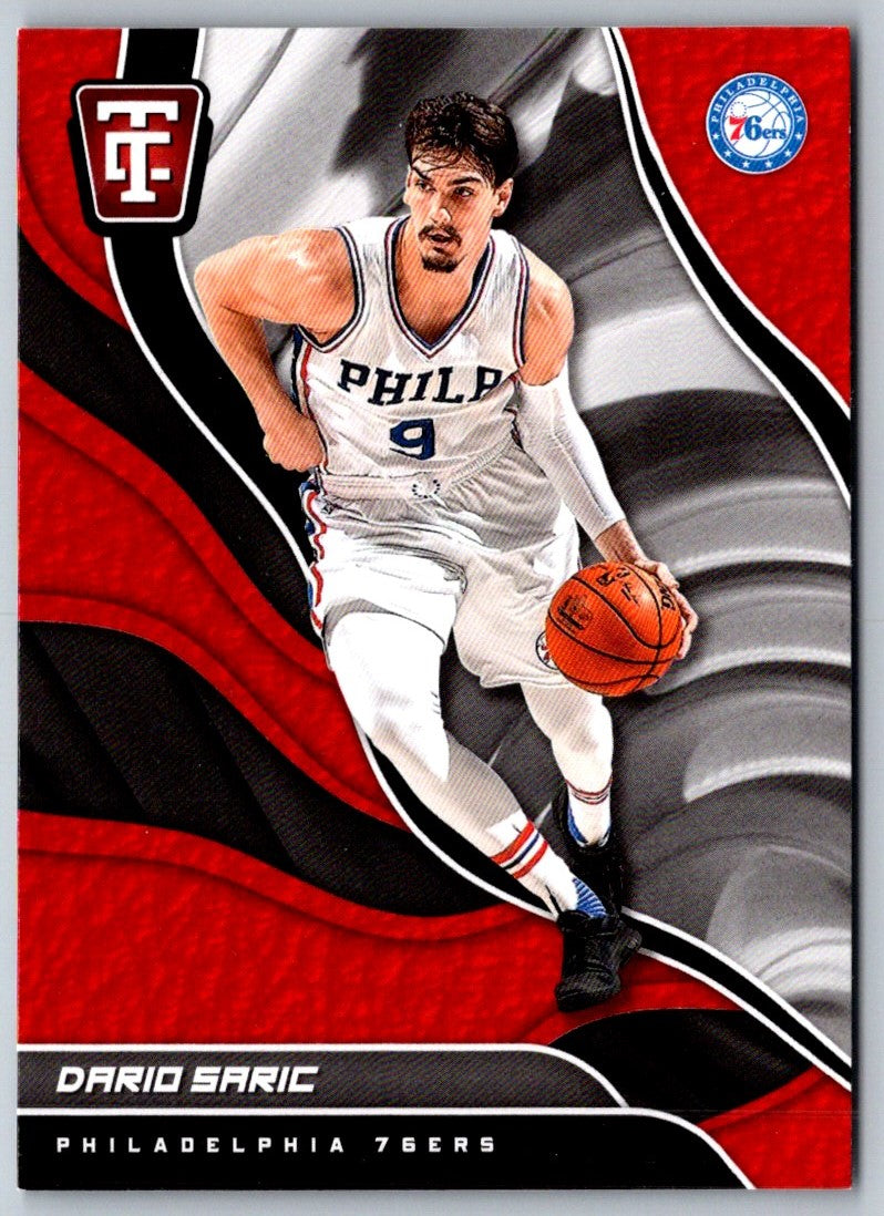 The 2017 Panini Totally Certified Dario Saric #38 Philadelphia 76ers card is a must-have for any basketball collector. It features an amazing image of Saric mid-air, with a bold Philadelphia 76ers logo in the background. It is printed on quality card stock, which is perfect for displaying in any collection. The back of the card has a detailed biography of Saric, along with his season stats. This card is an absolute steal and a great way to show your appreciation for the young 76ers star. Don't miss out on this fantastic card!